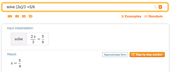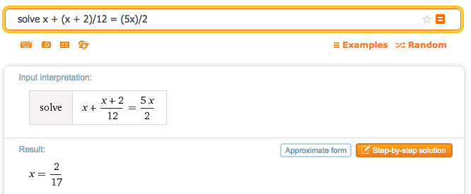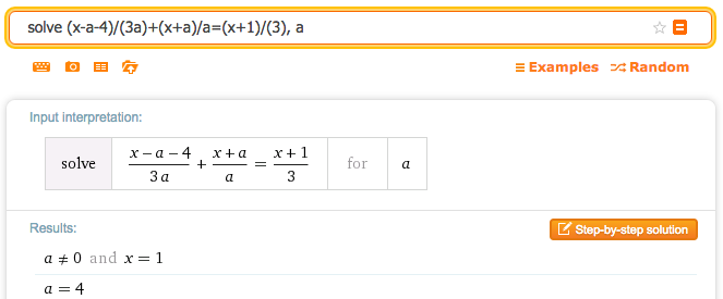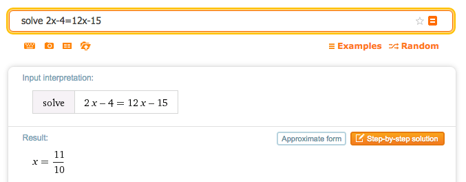 Wolframalpha puede entregar la solución de diferente tipos de ecuaciones lineales. Resuelve ecuaciones con incógnita en el denominador, ecuaciones literales, ecuaciones con coeficiente fraccionario.