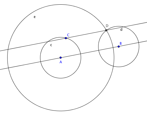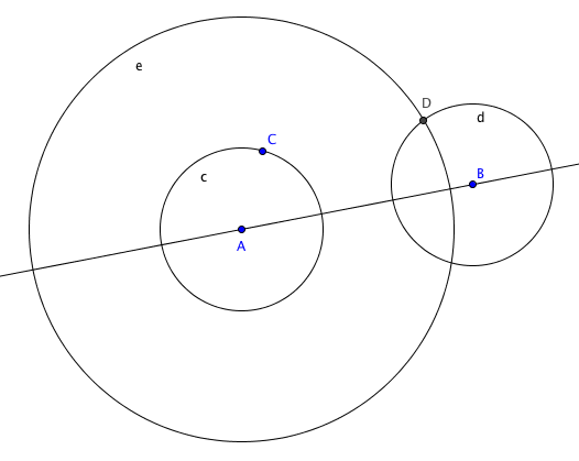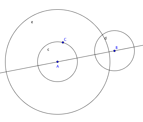 repetimos con la herramienta «compás«, click en A, click en C (para marcar el radio) luego click en B para construir la circunferencia d, como se ve en la siguiente imagen: