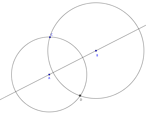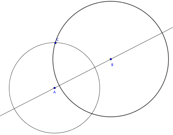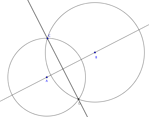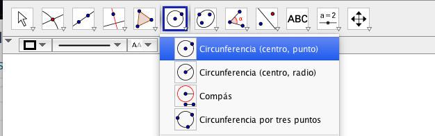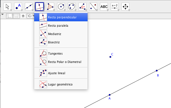 Vamos a construir una recta perpendicular utilizando la herramienta «circunferencia» de geogebra. Al igual que el ejemplo anterior trazar una recta perpendicular desde el punto C a la recta AB.