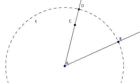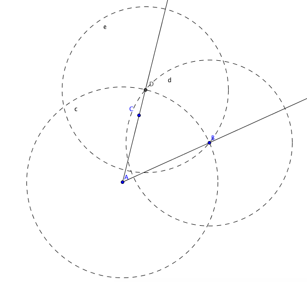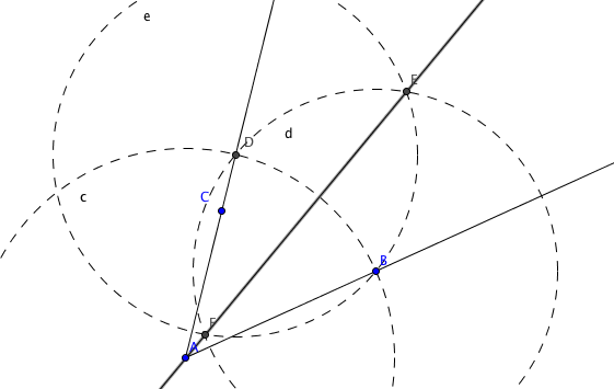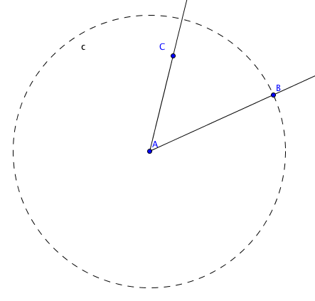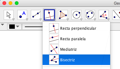 y hacemos click en los puntos B,A y C (en ese orden). Geogebra construye automáticamente una bisectriz en al ángulo BAC.