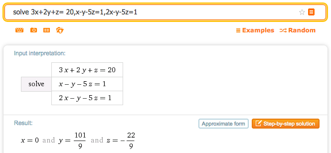 Wolframalpha puede resolver sistemas de ecuaciones lineales. El procedimiento